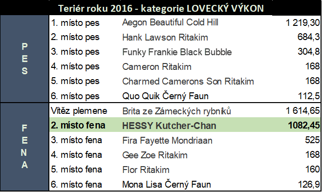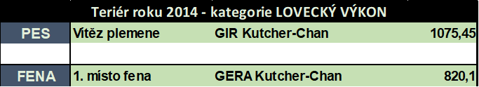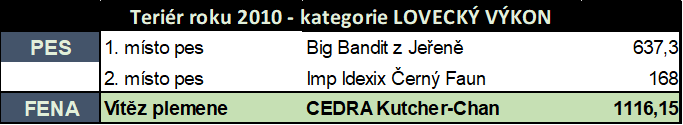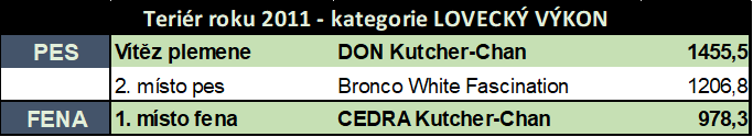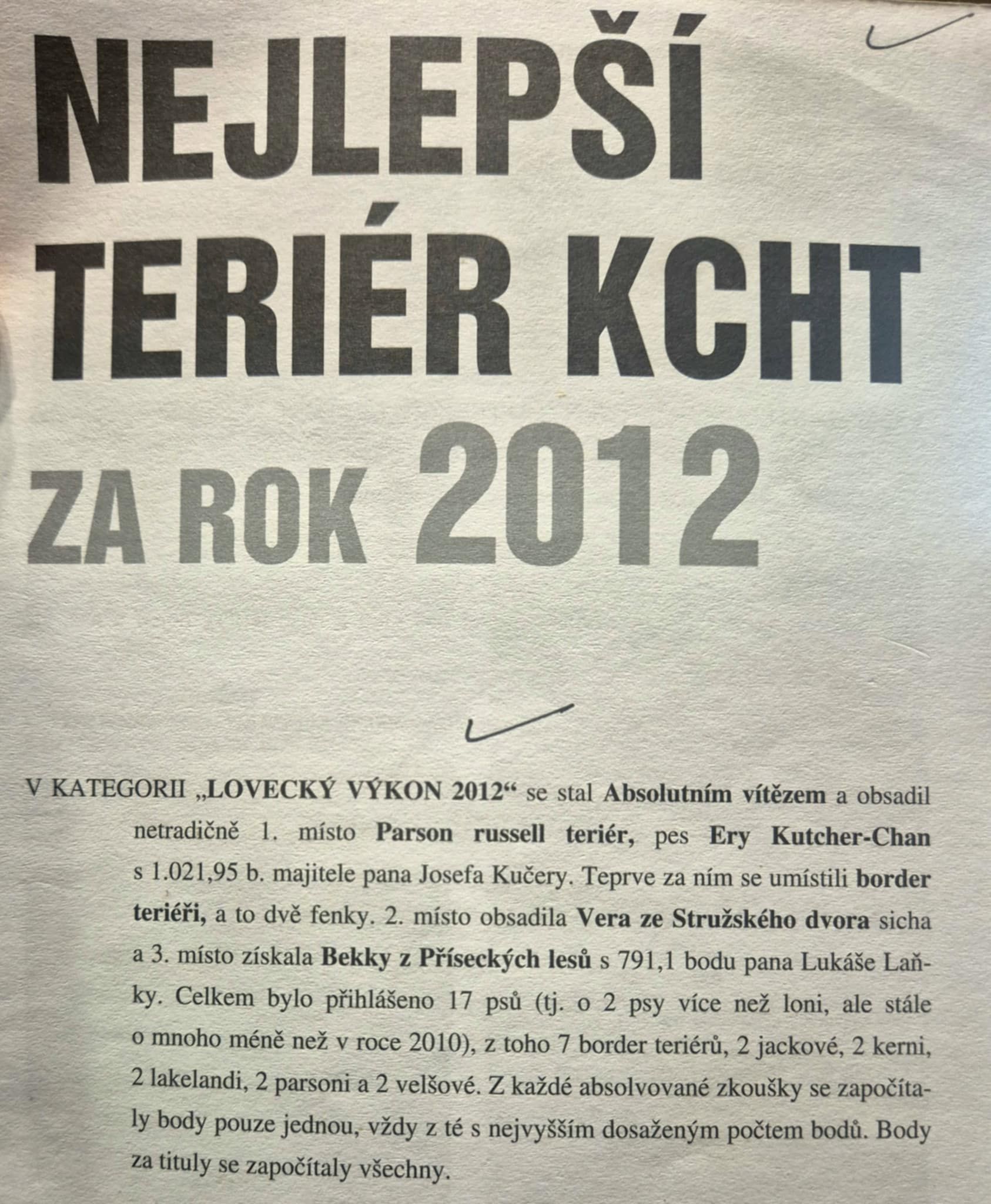 2012 - Ery Kutcher-Chan (1021,95 b.)- Nejlepší teriér r. 2012 KCHT v kategorii Lovecký výkon a absolutní vítěz celého klubu KCHT ze všech teriérů.
